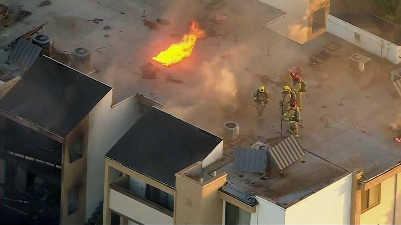 Eight buildings were damaged or destroyed after a blaze erupted at an apartment complex construction site near the 10 Freeway in Upland Wednesday morning.