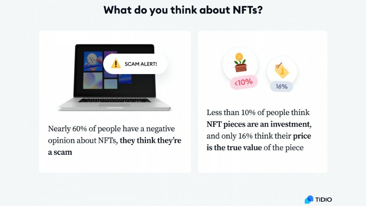 NFTs likely scored lower because 60% of respondents think they’re a scam, and less than 10% see them as a serious financial investment, Tidio says. Just 16% think the current prices for these digital assets represent their true value.