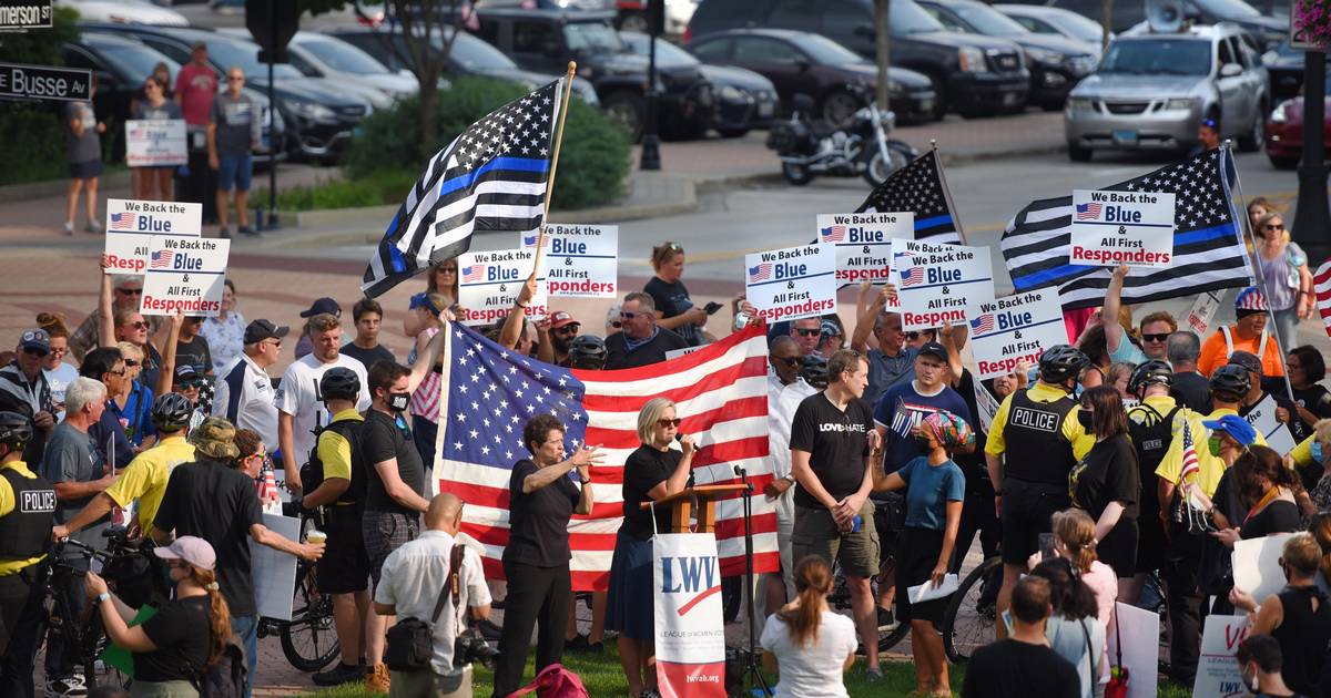 Hundreds gathered outside Mount Prospect village hall in August, when a divided village board voted to have the police department’s controversial uniform patch removed. Police leaders sold hundreds of decommissioned patches, raising more than $23,000 to help families of fallen officers.