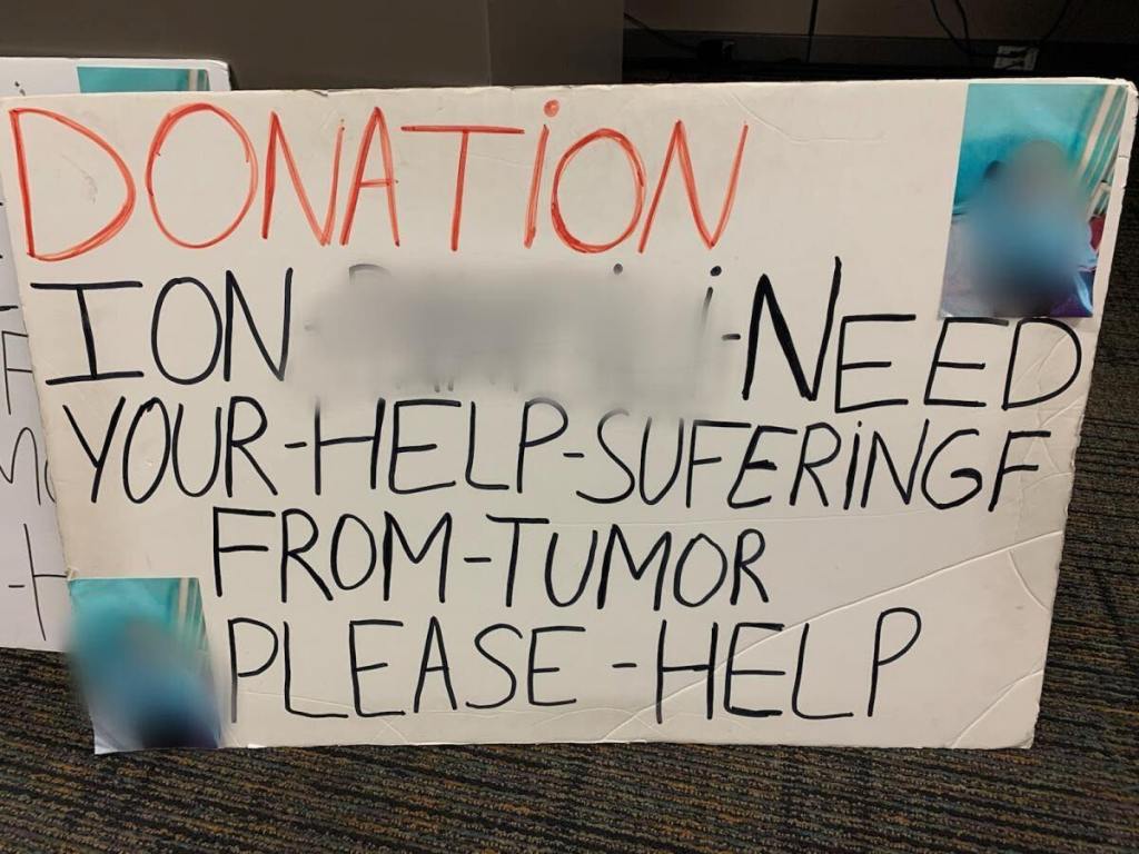 Police in the city of Riverside in December issued the same warning after arresting three people who the police said also were scamming the public with a tall tale. The young adults, described as people who move from place to place in groups, had swindled well-meaning donors out of $400 with a sign that said a girl was suffering from “akute leukemy.”