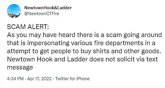 Fire departments in Harwinton, Killingworth, Seymour and Newtown issued alerts over the weekend warning residents that these messages were scams and to ignore them. Newtown Hook & Ladder posted a note on its social networks last weekend reminding followers that their members do not solicit via text message. Hawleyville Volunteer Fire issued a similar statement on its Facebook page.