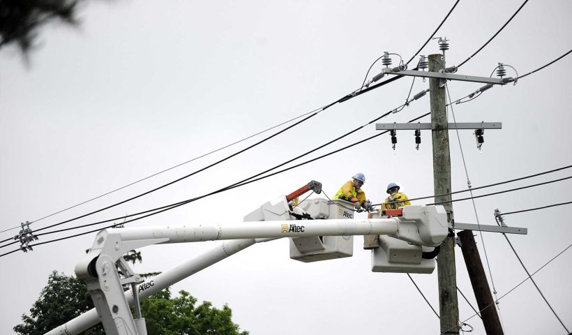 July 19, 2021 Workers with Riggs Distler, sub-contractors for Eversource, move electrical wiring at the intersection of Routes 25 and 302 in Newtown Monday, June…