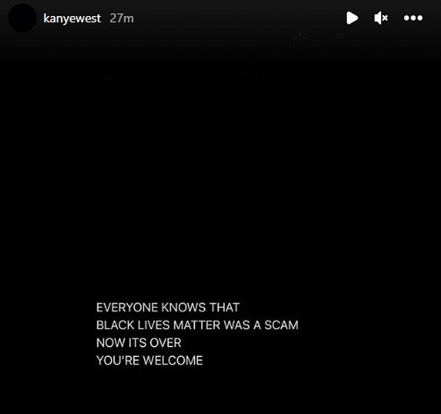 On Tuesday, Kanye stoked the outrage again by posting on Instagram: ‘Everyone knows that Black Lives Matter was a scam. Now it’s over. You’re welcome.’