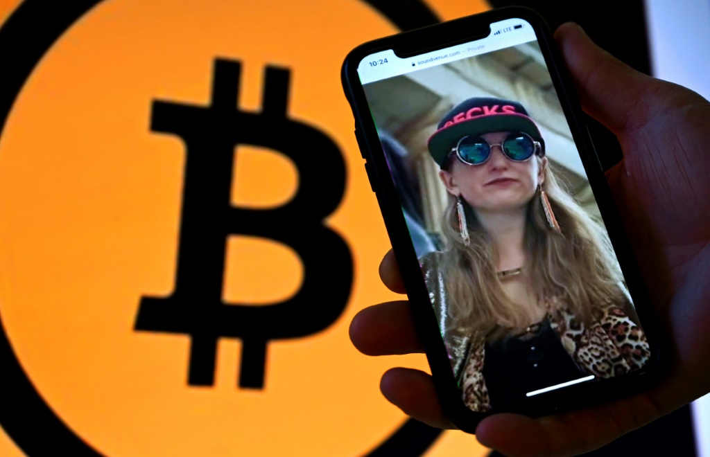 A picture of Heather Morgan, also known as “Razzlekhan,” on a phone in front of the Bitcoin logo – Copyright AFP PEDRO PARDO