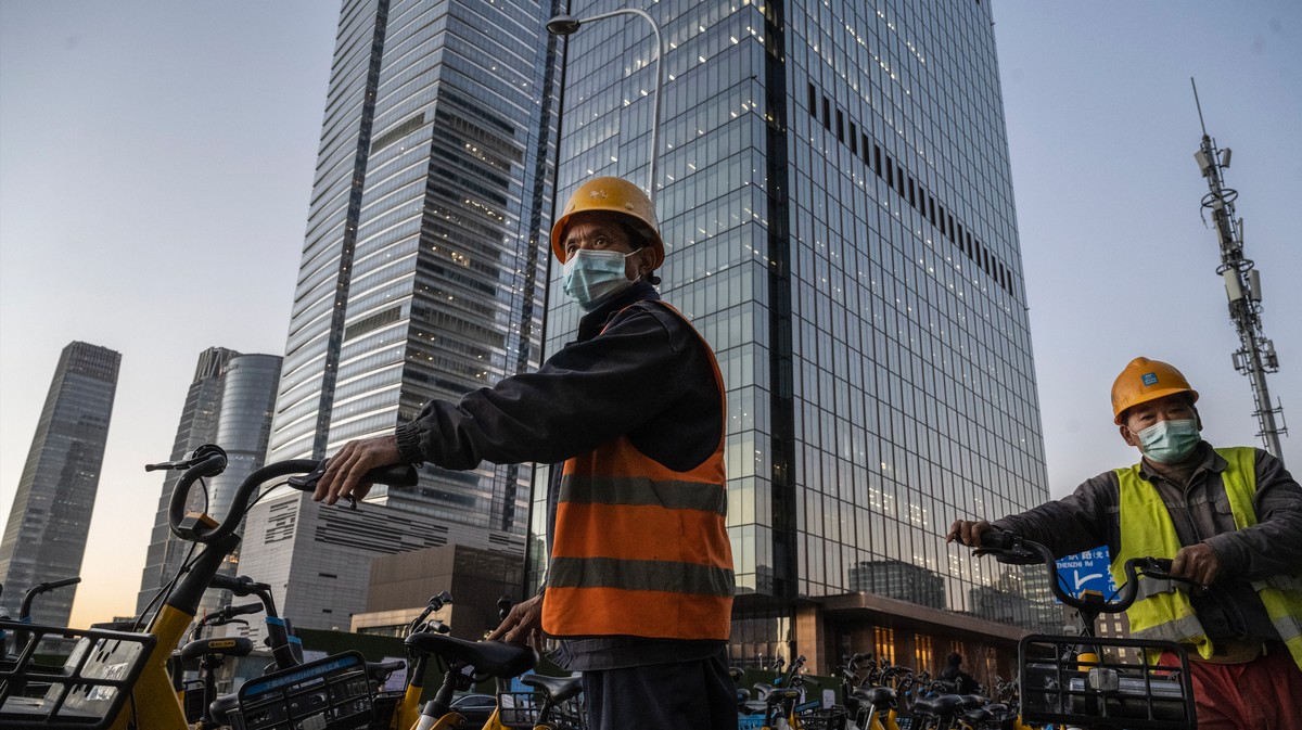 Workers get onto shared bikes as they leave a construction site of a skyscraper in Beijing on November 26, 2021. Photo: Kevin Frayer/Getty Images