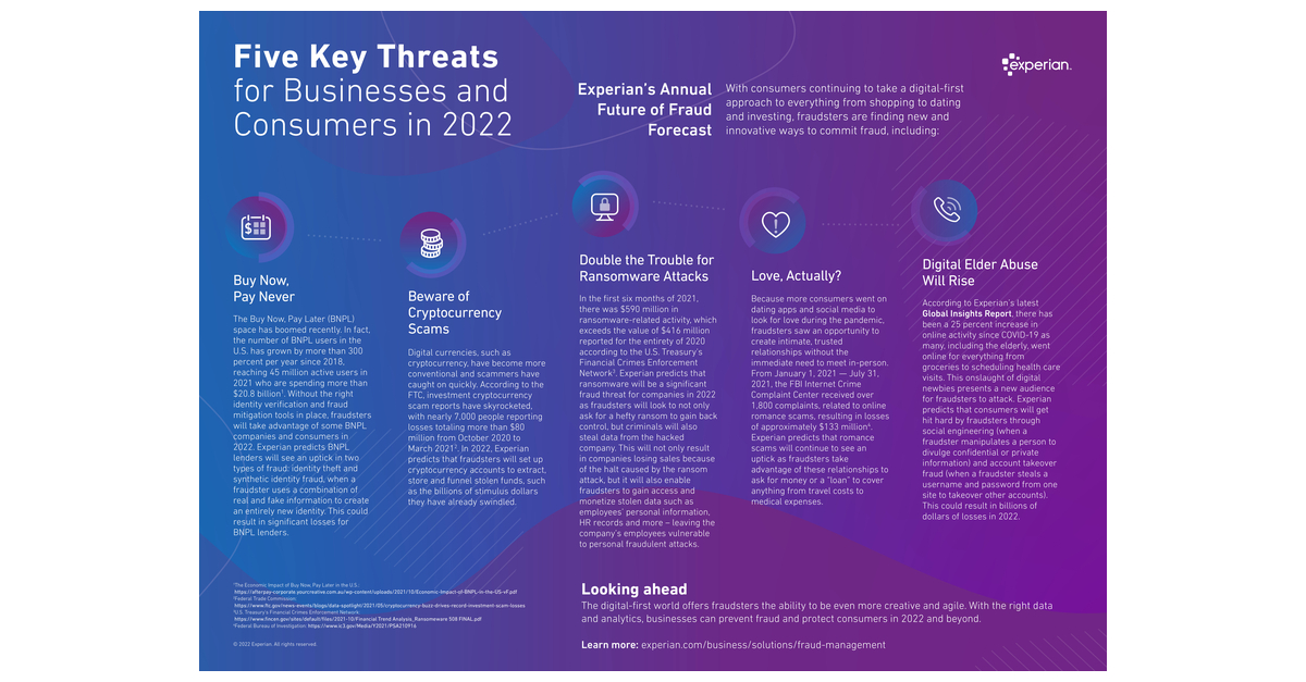 - Buy Now, Pay Never – The Buy Now, Pay Later (BNPL) space has grown massively recently. In fact, the number of BNPL users in the US has grown by more than 300 percent per year since 2018, reaching 45 million active users in 2021 who are spending more than $20.8 billion1. Without the right identity verification and fraud mitigation tools in place, fraudsters will take advantage of some BNPL companies and consumers in 2022. Experian predicts BNPL lenders will see an uptick in two types of fraud: identity theft and synthetic identity fraud, when a fraudster uses a combination of real and fake information to create an entirely new identity. This could result in significant losses for BNPL lenders.