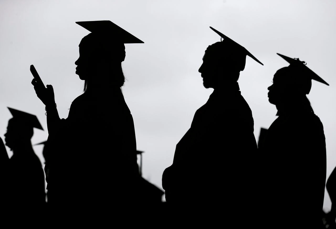 FILE – In this May 17, 2018, file photo, new graduates line up before the start of the Bergen Community College commencement at MetLife Stadium in East Rutherford, N.J. (AP Photo/Seth Wenig, File)