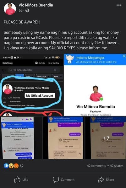 In a social media post, Barangay Captains Vic Buendia (Labangon) and Jerson Cadampog (Pung-ol Sibugay) warned their constituents against persons using their names to cash in from their supposed mobile wallets to pay for their purchase of barangay supplies.