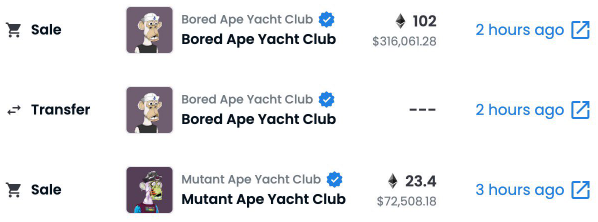 The instant transfer and ‘sale’ of the scammed holder’s BAYC and MAYC NFTs