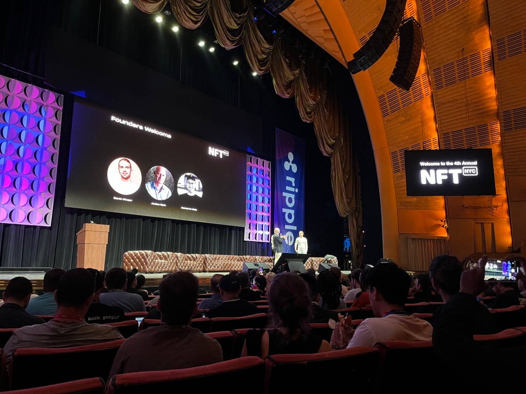 The whining cords of Guns N’ Roses’ “Sweet Child O’ Mine” echoed across the dim, velvet-lined main stage of Radio City as attendees of the third-ever NFT.NYC conference filtered in to take their seats, before fading into the next track, Pitbull’s “Give Me Everything.” It was a strange soundtrack that would end up being totally appropriate for the awkward friction and manic messaging that permeates this kind of convention.