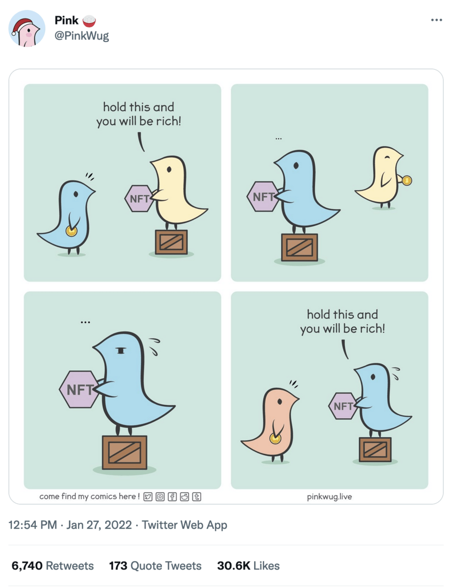 Case in point is a recent move by two wildlife conservation organizations to embrace NFTs as a digital version of the classic “adopt a zebra” type fundraising campaigns. Beyond the obvious ponzi scheme aspects of NFTs, and more because of the environmental impacts of blockchains and NFTs as we’ve discussed before, the move has garnered plenty of backlash, like Kate Aronoff’s great New Republic piece asking Why the Hell Is the World Wildlife Fund Selling Animal NFTs?, for example.