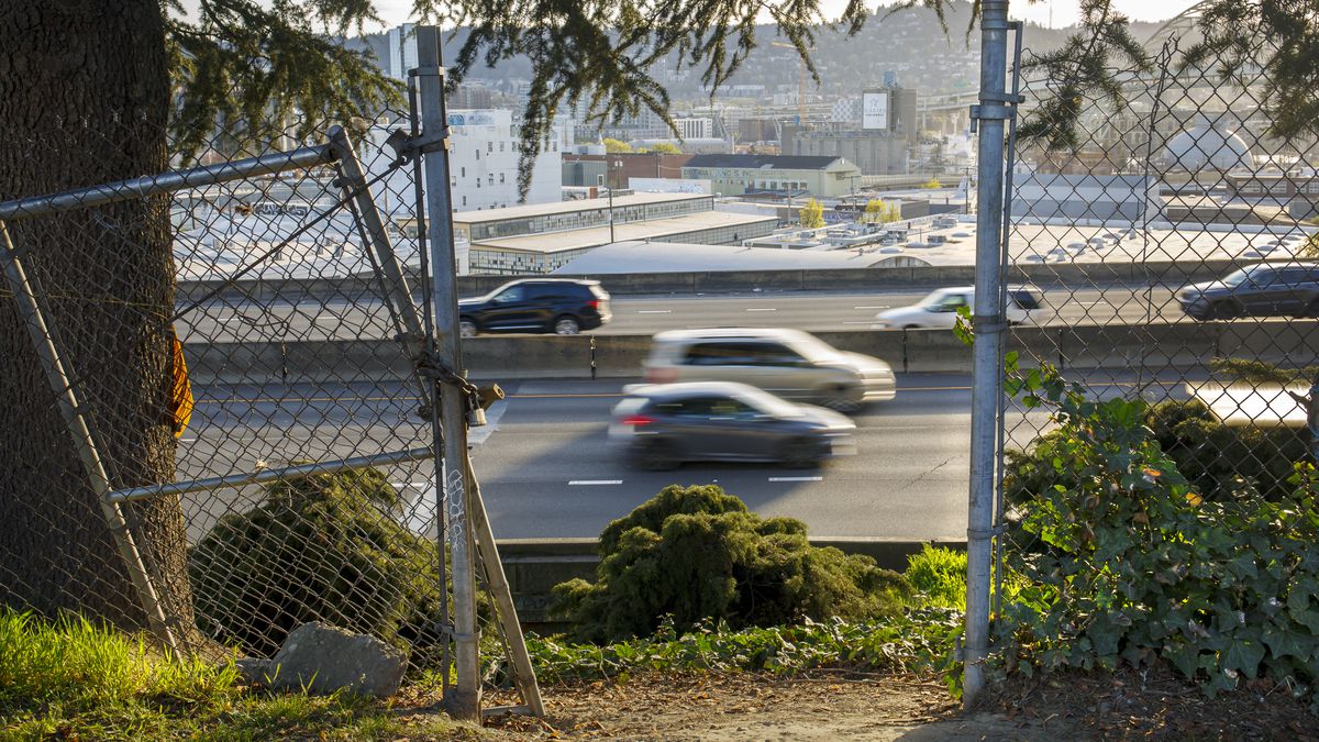 The I-5 freeway is seen through the fencing at the back of Harriet Tubman Middle School in North Portland, April 9, 2021. That stretch of freeway is at the center of an ODOT project to help revitalize Portland’s Albina District, the city’s former Black urban core destroyed when the freeway was originally built in the 1960s. At the same time, ODOT recently dismissed a member of an advisory committee for racist and sexist comments.