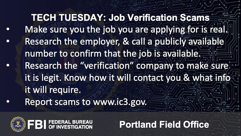 PORTLAND, Ore. (KTVZ) This week, the Oregon FBI’s Tech Tuesday segment focuses on building a digital defense against job verification scams.