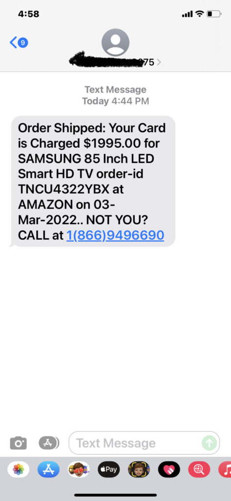 A reader contacted BladenOnline after receiving a suspicious text message this week. The text message in question claimed to be from “Amazon” and stated an order had been shipped and the customer’s card was charged. Then the text message read, “NOT YOU? Call at” and gave a phone number to call.