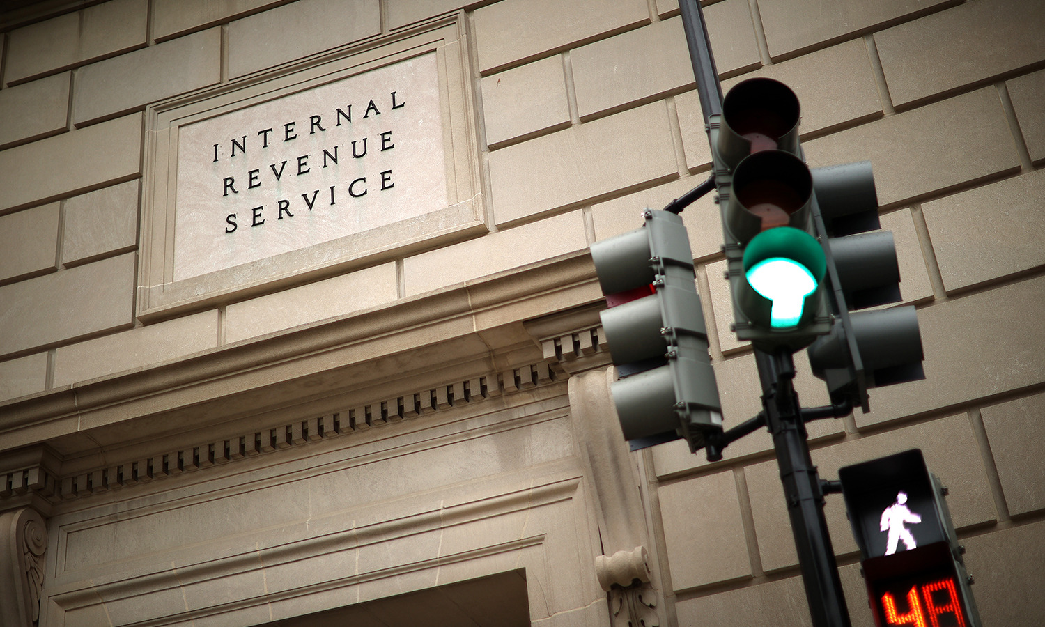 The Internal Revenue Service headquarters building appeared to be mostly empty April 27, 2020, in the Federal Triangle section of Washington. (Photo by Chip Somodevilla/Getty Images)