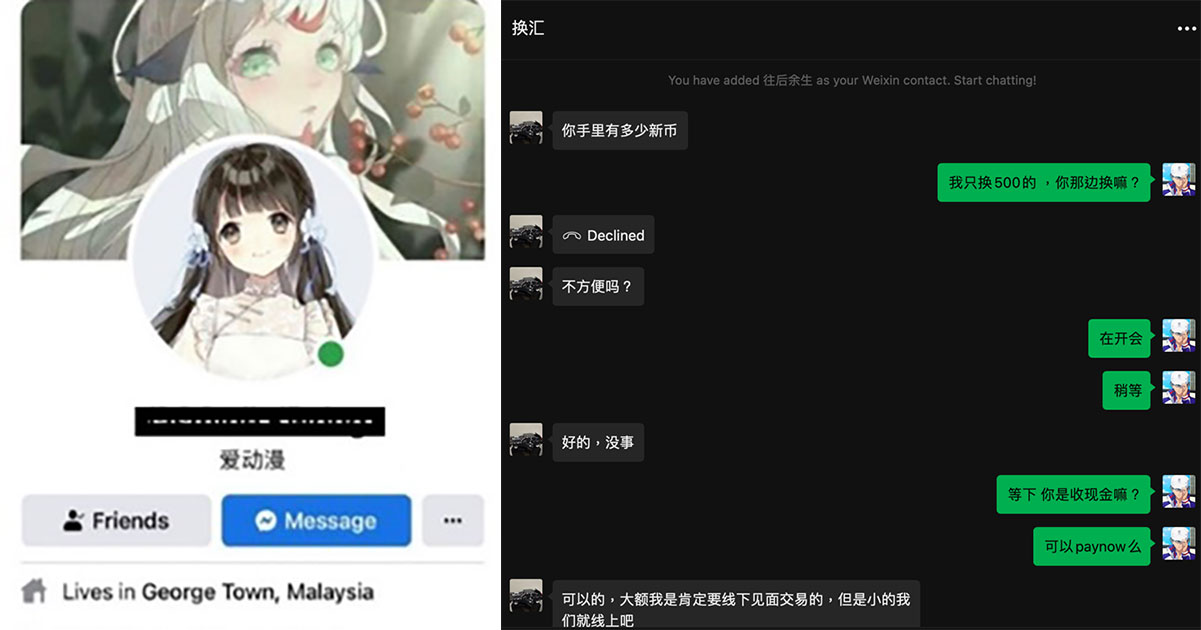 Victims would be enticed by favourable exchange rates offered by scammers providing money changing or cross-border money transfer services on e-commerce or social media platforms, such as WeChat, Facebook or Carousell.