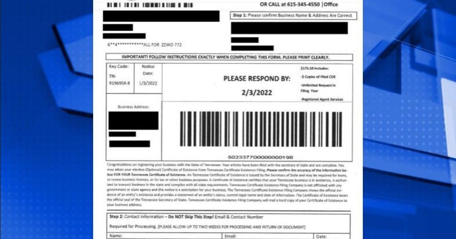 Secretary Hargett said in his statement the way the scam is targeting businesses is with a deceptive mailer from a company that goes by two names: Tennessee Certificate Service and TN Certificate of Existence Filing Company.