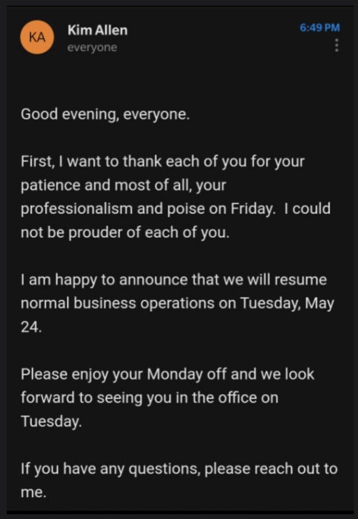 [UPDATE 11] Alliantgroup employees in Houston returned to work on Tuesday morning after they were sent home early Friday following the court-ordered raid of their office on May 20. Thanks to a tipster, here is the email they received Sunday evening from Kim Allen, senior director of talent: