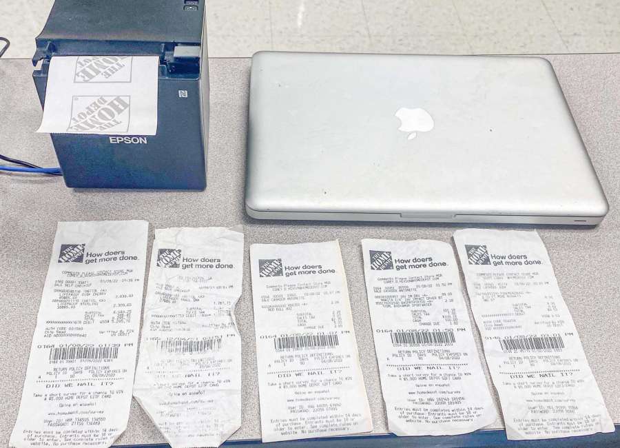 Inside the van, investigators located an Epson receipt printer connected to an Apple laptop. The transaction number on the fake receipts did not match any flooring products and did not equal $5,295.20, the report stated.