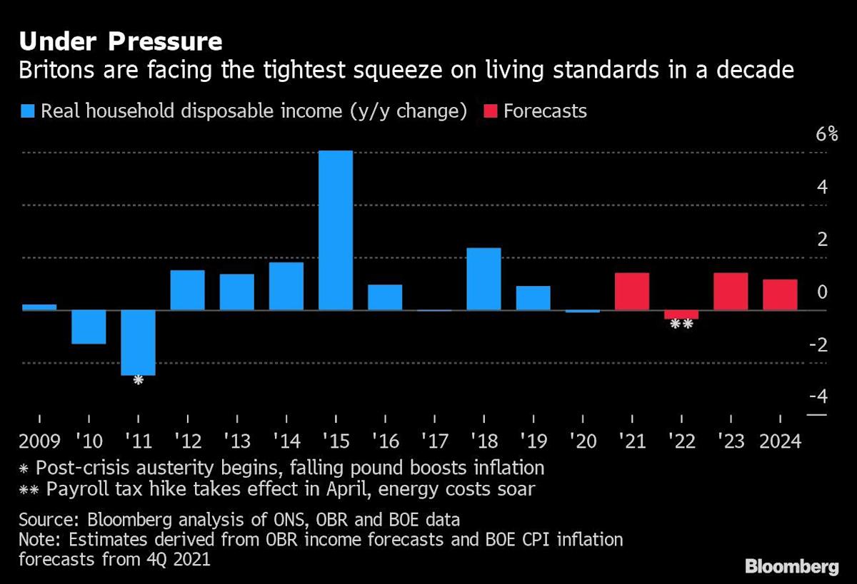 (Bloomberg) — Britons are about to discover just how much living costs are set to rise, how painful the squeeze on incomes will be this year and what the government plans to do about it.