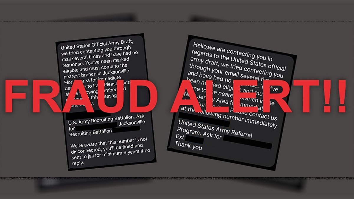 The text messages will state that a military draft is occurring and the recipient must report for duty or face legal action and financial consequences.