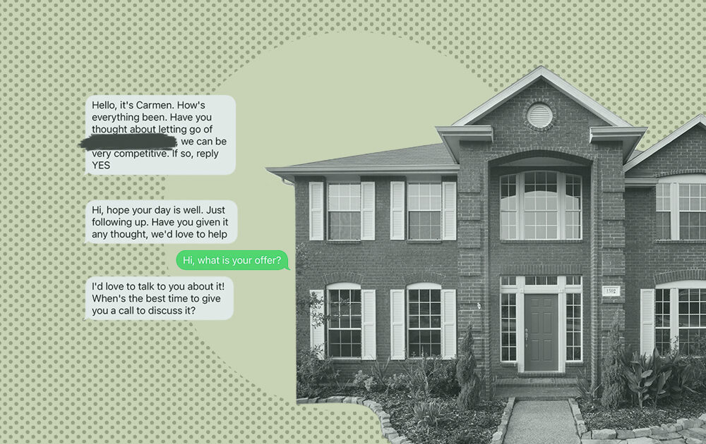Most homeowners are familiar with these solicitations, which come in the form of a text or letter from people or companies that want to buy your house, even if it’s not up for sale.
