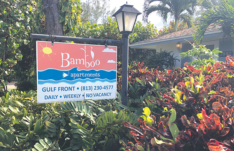 A sign posted at Bamboo Apartments in Holmes Beach April 8. An internet scammer created a phony rental agreement for a Bamboo unit and used it to defraud a Delaware couple. Islander Photo: Kane Kaiman