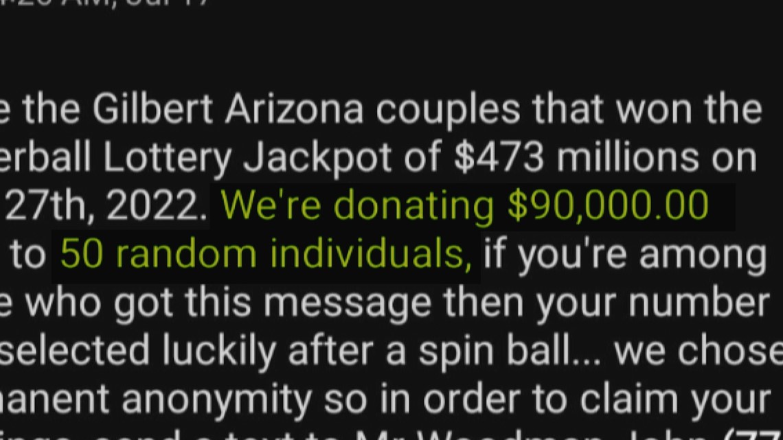 Diana Izurieta said she got a text message from someone claiming to represent a Gilbert couple who won $474 million in the lottery this year. The message said the couple had picked 50 people at random across the country to give $90,000 each. The text gave a number to contact, “Mr. Woodman,” to coordinate payment.